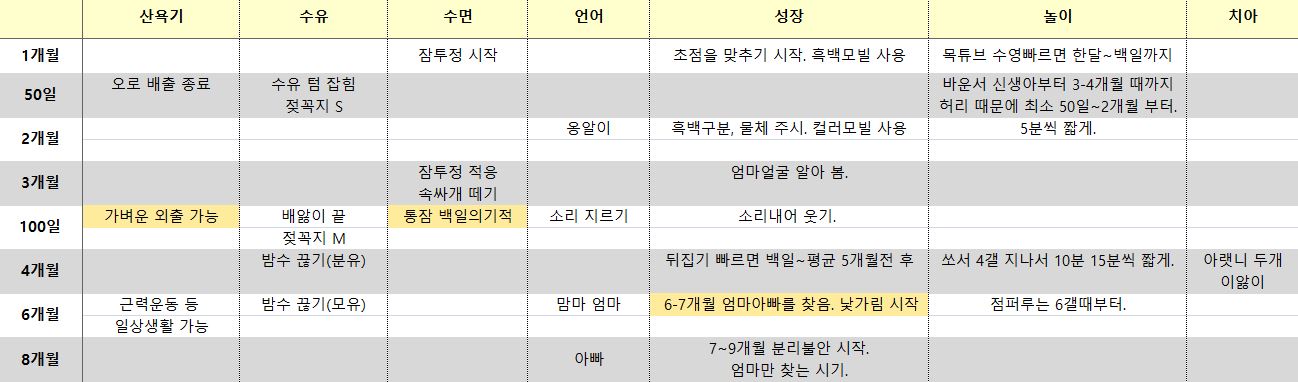 | 혼자앉기 | 7개월 | 5~9개월 |
